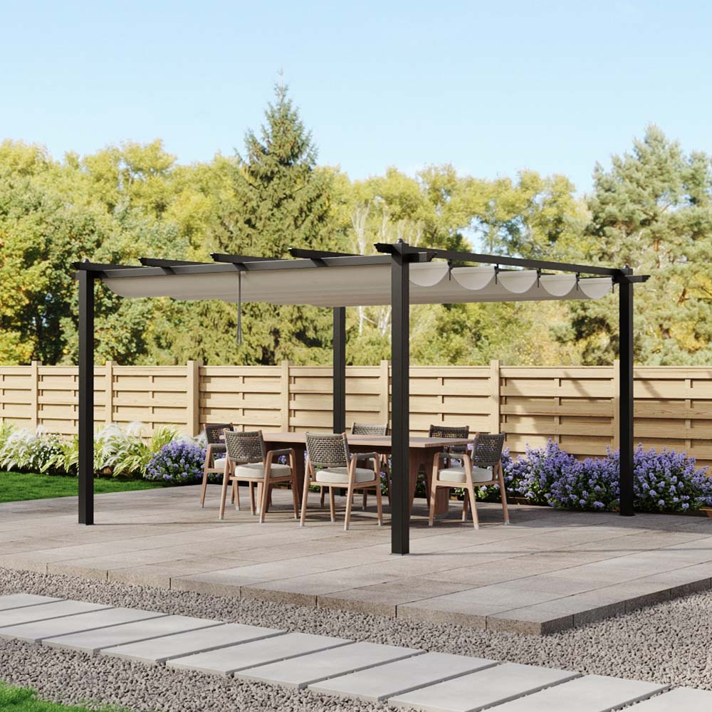 If you love unwinding outdoors or dining in the open air, this pergola is the perfect addition to elevate your outdoor experience. Built with sturdy yet lightweight aluminum posts, it is designed to withstand the test of time while adding style and functionality to your space. Its waterproof canopy provides reliable shelter from unexpected rain, so you will not have to rush indoors. On sunny days, you can easily adjust the canopy to control the amount of sunlight filtering through. Elevate your outdoor space with this stylish and durable pergola, creating unforgettable moments in comfort and elegance.