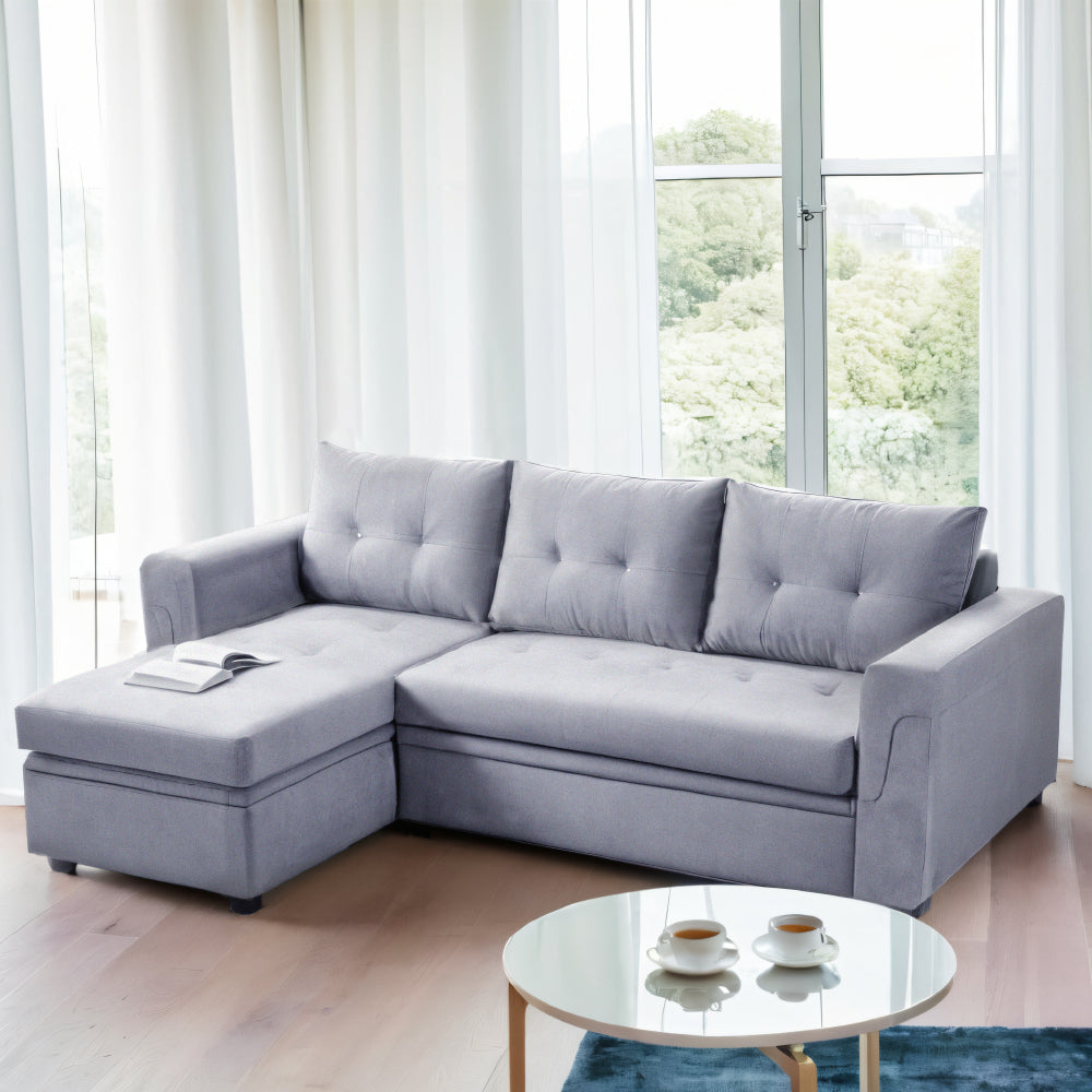 Be instantly captivated by this 3-seater pull-out sofa bed. The fabric upholstery in a perfectly balanced shade of grey adds an elegant touch to any space, while the tufted detailing brings timeless charm to the piece. Designed with a reversible L-shaped extension section that can be positioned on the left or right, users can effortlessly configure the layout to suit personal preferences and room arrangements during assembly. The thick cushions and supportive backrest ensure lasting comfort, whether used as an everyday sofa or transformed into a bed. Additionally, the extended seating area conceals a storage compartment, perfect for organising daily essentials such as clothing or bedding, helping to keep your home neat and tidy. Whether you are looking to create a cosy lounging corner in your living room or require an extra bed for guests, this sofa bed is the perfect solution!