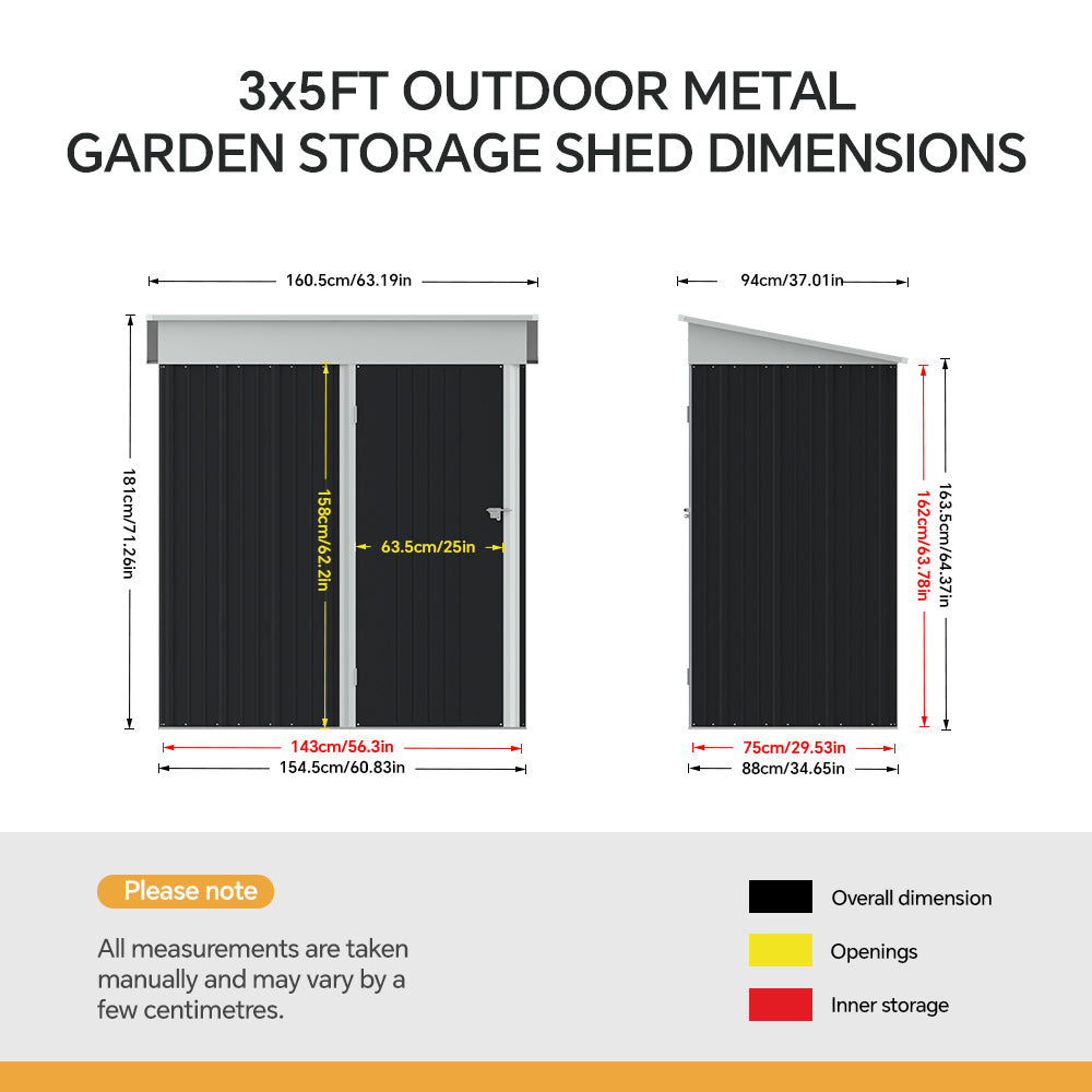 This storage shed covers a small footprint yet offers sufficient storage space without sacrificing valuable outdoor space. Adopting high quality steel that is treated with zinc, the shed guarantees reinforced resistance to corrosion and weather. Standing 180cm high, not only does this shed provide space for your taller equipment, it is also built with 2 tiers of shelves that allow you to store other smaller items vertically, utilizing the space for achieving organization outdoors.