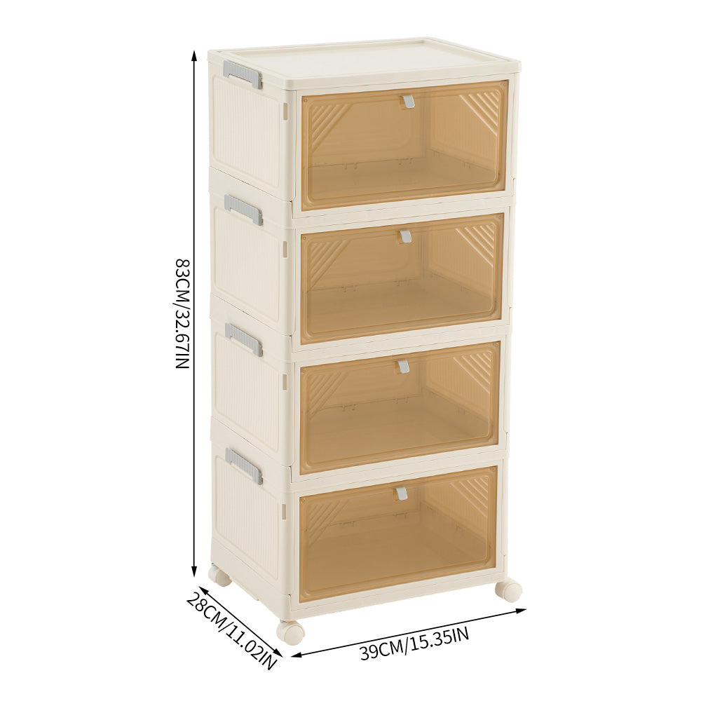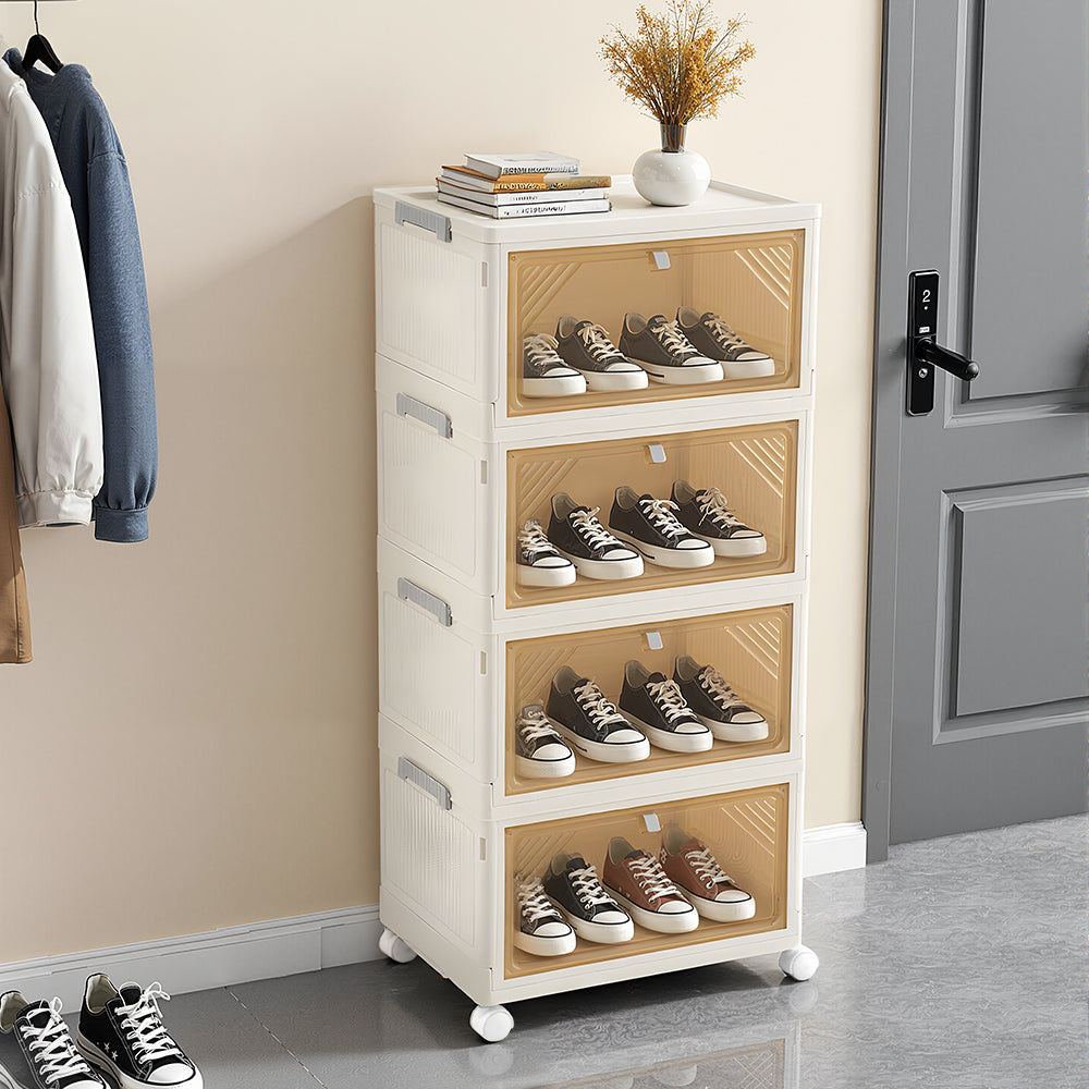 Keep your shoes neatly organised with this shoe cabinet! Featuring four independent storage compartments, it lets you sort and store footwear for a tidy look. Each tier comes with a flip-down cover that effectively blocks dust and moisture, keeping your shoes clean and dry. The front transparent cover allows it to be easy to see and access your shoes at a glance. The flat top is perfect for everyday essentials like keys, umbrellas, or bags, maximising space utility. Mounted on four smooth-rolling wheels, it is easy to move and securely stays in place wherever you need it.