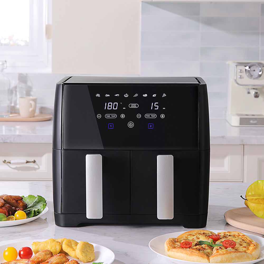 This stylish air fryer by Livingandhome is a perfect kitchen helper for anyone looking to enjoy delicious fried food with fewer calories. Thanks to the large capacity with each basket taking up equally 4L, you can easily cook for a family of four or more. The dual basket design allows you to cook two different kinds of dishes at the same time or double the amount of the same dish to speed up your food preparation. Additionally, the 30-minute timer with alert and reminder will let you know that your food is cooked to perfection. With a simple touch on the screen, you can choose from eight programs to let your ingredients start frying.