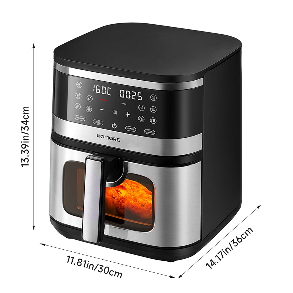 Enjoy healthier and tastier meals with our fantastic air fryer. Its rapid hot air circulation, powered by a 3600 RPM fan, enables low-oil or oil-free cooking for crispy and tender results. Ten cooking modes, including roasting, reheating, frying, and more, can be easily controlled by user-friendly panel. A convenient viewing window with an interior light allows for easy monitoring without interrupting the cooking process, and its quiet operation ensures a peaceful kitchen environment. Plus, the detachable cooking basket makes cleaning a breeze. For your safety, it features external vents, integrated overheat protection, and an automatic power-off function. Besides, its sleek and modern design complements any kitchens.