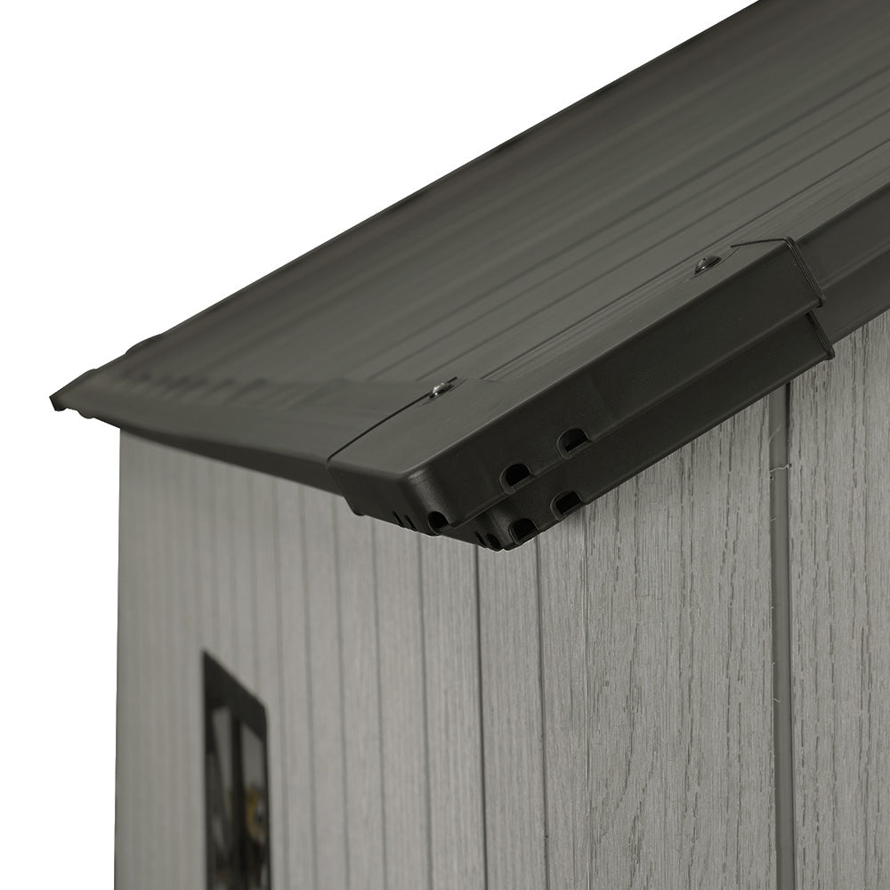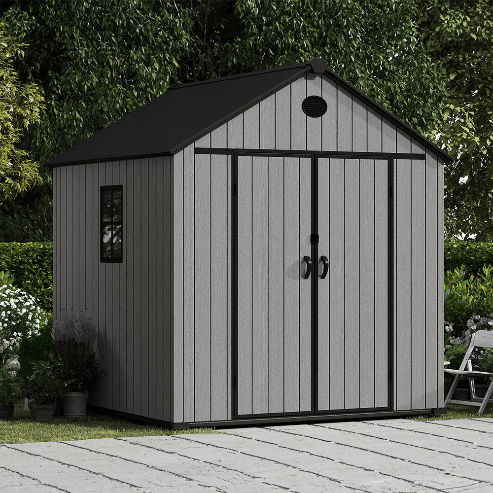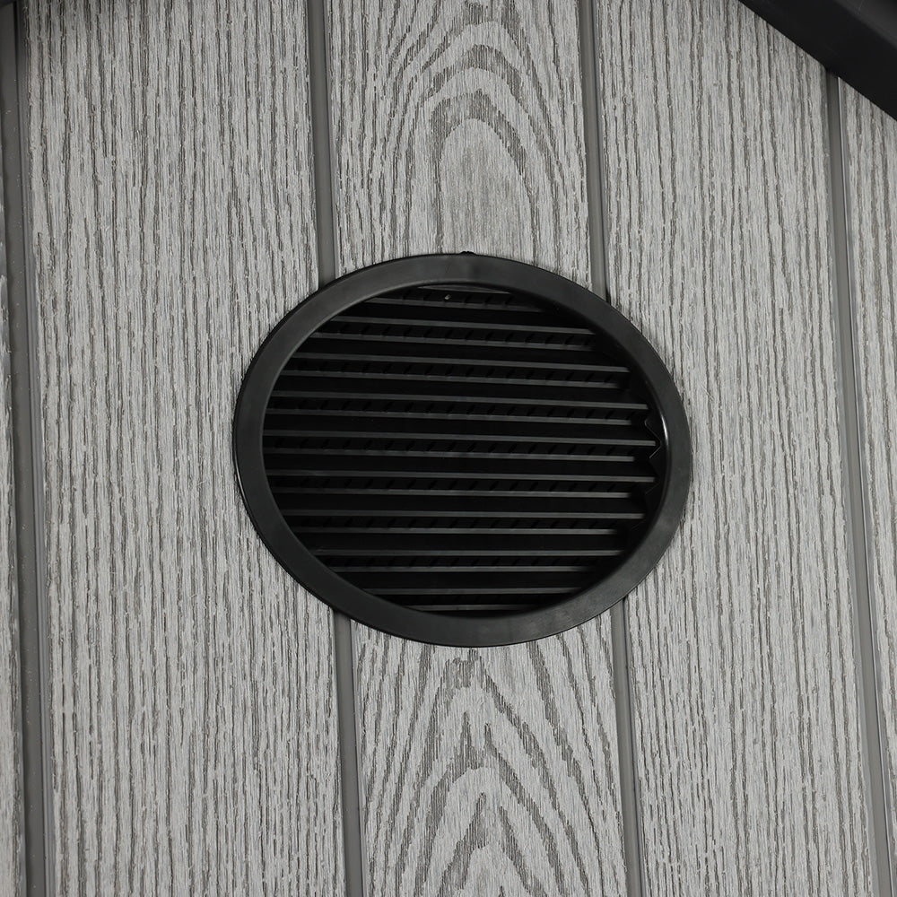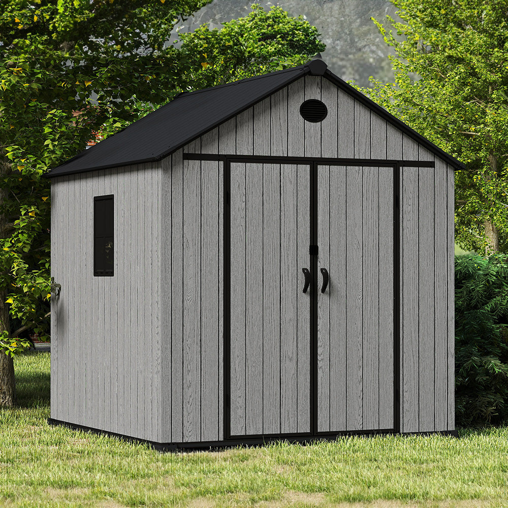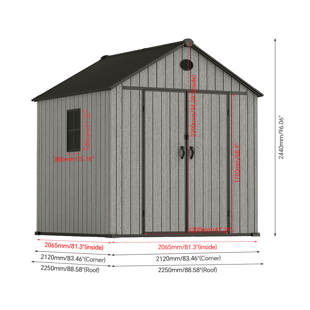 This premium apex-roof storage shed combines the classic look with modern durability. The robust construction of 16mm thick PP plastic panels and reinforced 1mm powder-coated metal strips ensures lasting weather resistance. Complete with a sturdy black foundation and lock, this spacious 8x8 FT shed provides secure, organized storage for tools, garden equipment, and outdoor essentials. Designed for straightforward assembly, it's a practical and stylish addition to any garden or backyard.