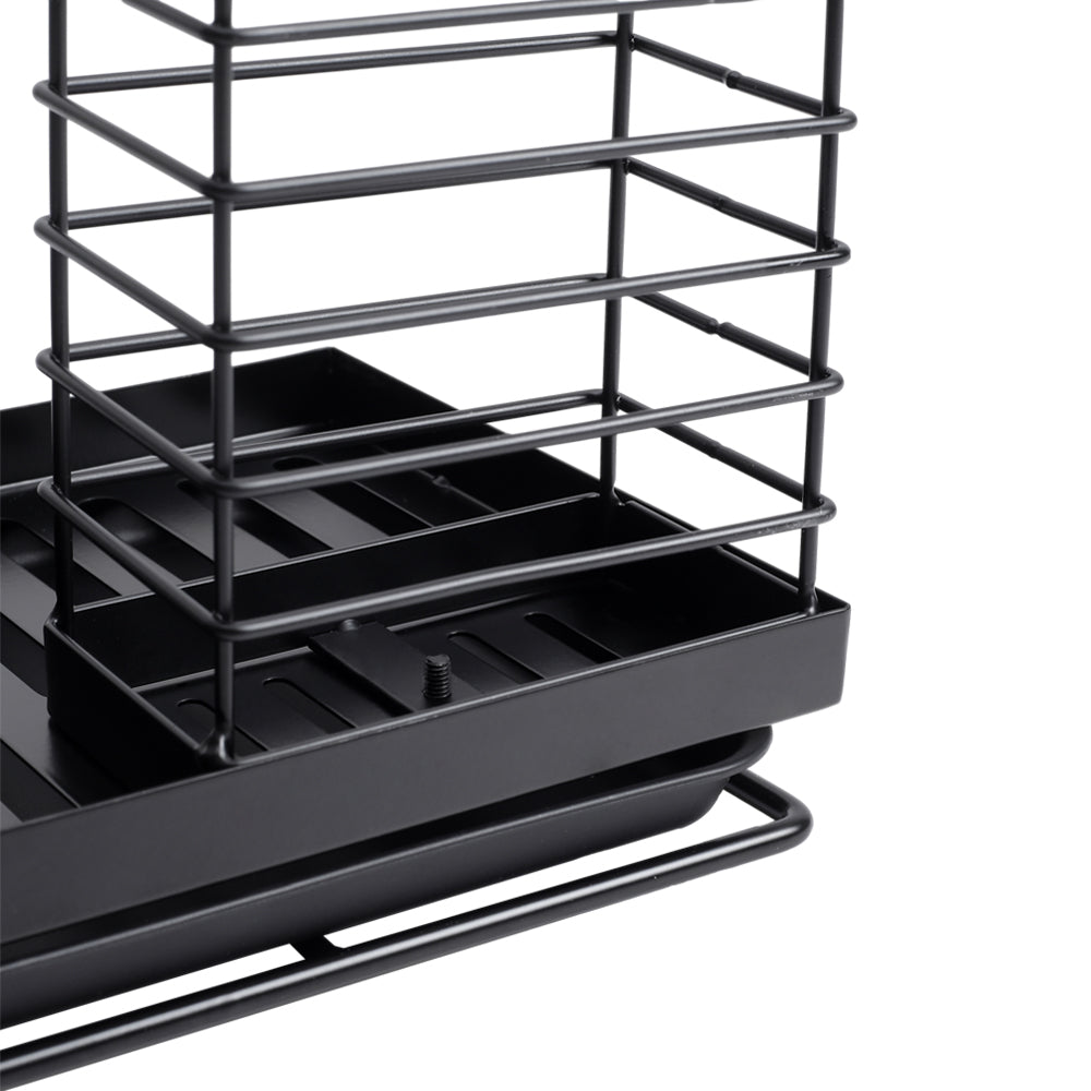 Maximize the efficiency of your sink space with this compact Black Steel Kitchen Sink Caddy Organizer. Crafted from sturdy steel, this organizer offers a convenient storage solution for your sink essentials. It features a spacious main tray for holding dish soap or sponges and a holder for storing scrub brushes and a rail for hanging dishcloths. It comes with a convenient drain tray that prevents water from pooling on your countertop, keeping it clean and dry.
