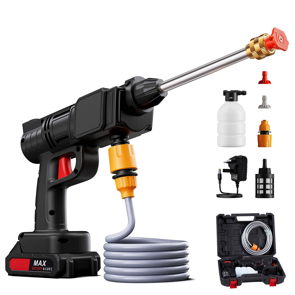 Tackle any cleaning task with our cordless handheld pressure washer! Featuring a high-pressure jet and a robust pure copper motor, it delivers strong water pressure with surprisingly low noise. Its 6-8 metre spray distance makes it perfect for watering plants, cleaning vehicles, or tidying your garden. Switch between direct, fan, and foam spray patterns to suit your needs, making car washing simple. The self-priming water pipe lets you draw water from buckets, ponds, or taps. Lightweight and compact, it is easy to carry and operate, reducing fatigue and ensuring a comfortable cleaning experience.