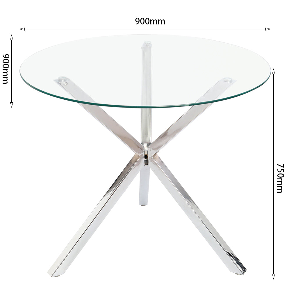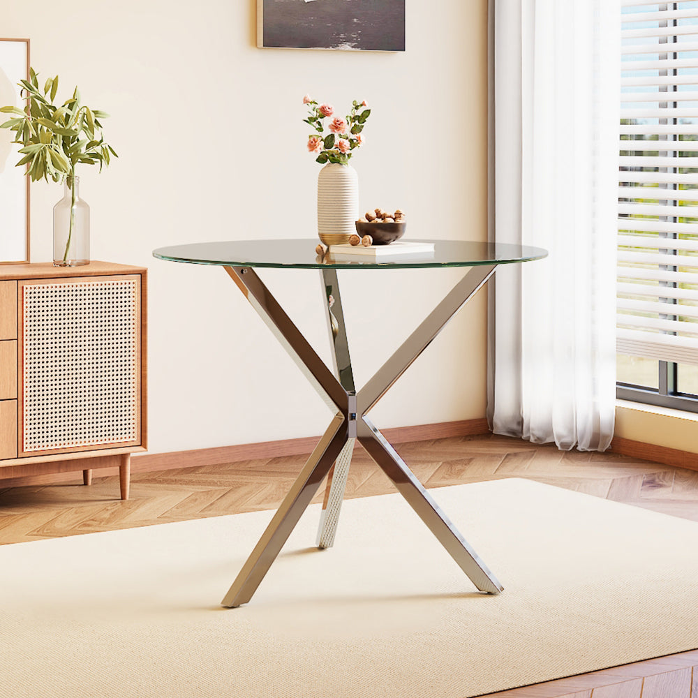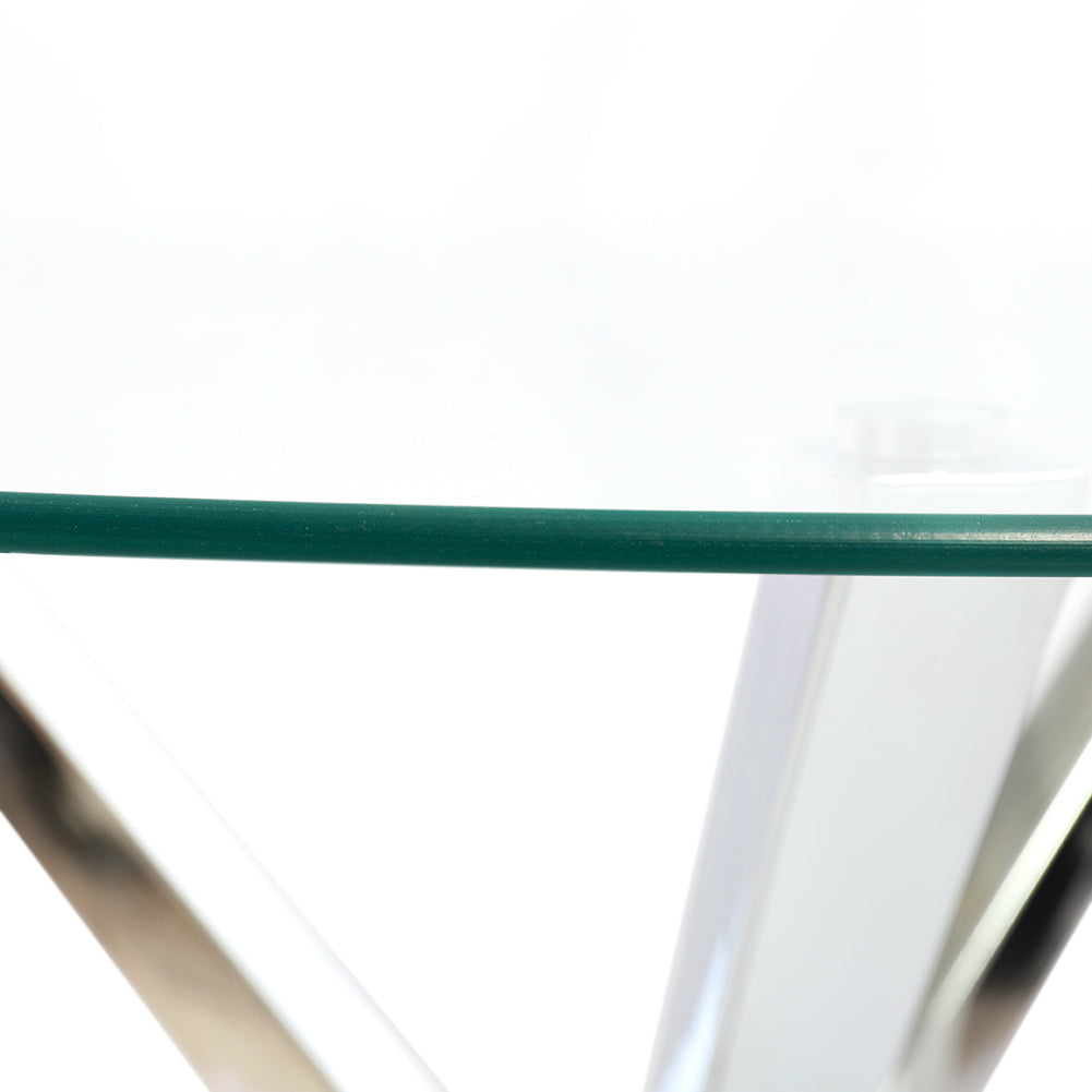Strikingly contemporary and distinct in design, this glass dining table is space-saving and stylish. This spacious surface provides plenty of room for phones, vases, plates, cups, books and other accessories. The clear tempered glass top and the crossover chrome base lend your dining space style and modernism.