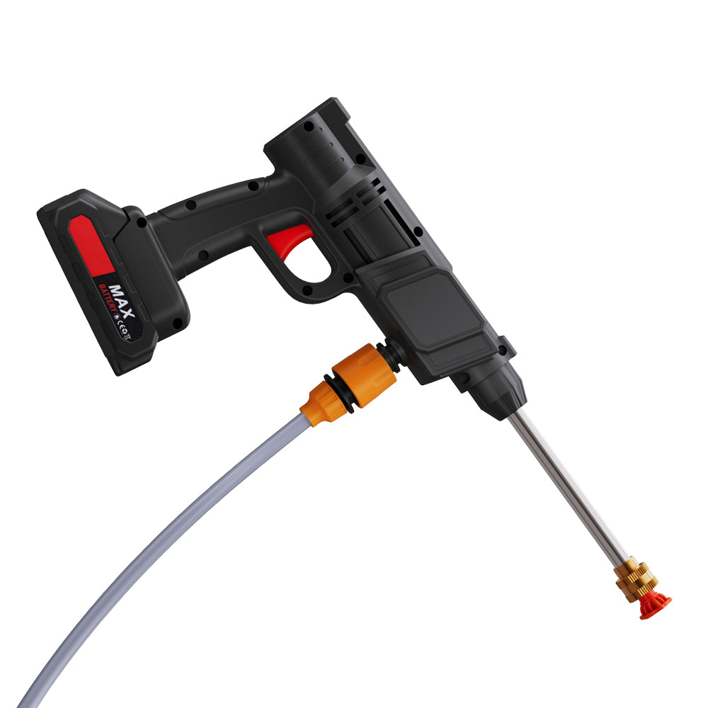 Whether you need to water plants, clean vehicles, or tidy up your garden, this cordless handheld pressure washer is the perfect solution for all your needs. It features a powerful copper motor that delivers strong water pressure while operating at low noise levels. The stainless steel extension rod resists rust and increases spray distance. The 5-metre hose, complete with a filter basket, effectively removes impurities, particles, leaves, and sludge, providing better protection for the washer. It supports drawing water from buckets, ponds, rivers, or garden taps (connector not included). With two nozzles offering both high-pressure and fan-shaped spray options, it meets a variety of cleaning requirements. Additionally, it comes with a foaming nozzle for easy cleaning of cars or floors.