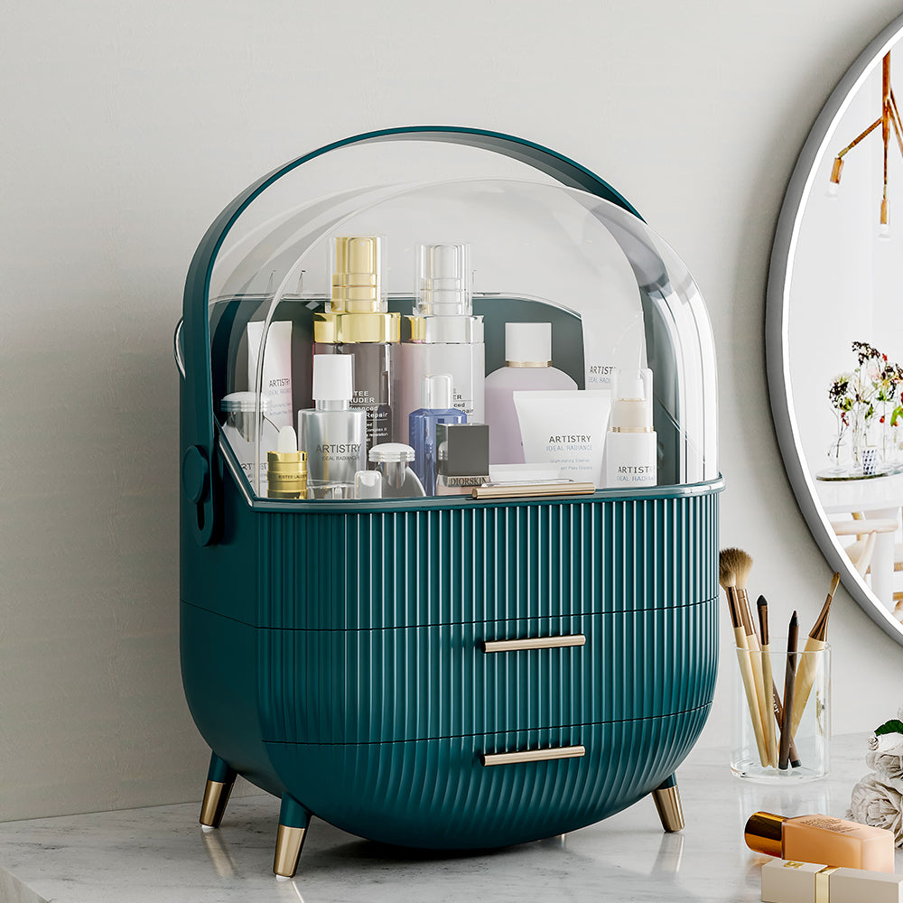 Here comes a good helper with your makeup organization and arrangement. Designed with a cabinet and 2 drawers, your tall bottles, makeup brushes can fit in perfectly. Rest assured that 70% of your tabletop space can be saved. It adopts thickened plastic and acrylic, so it’s scratch-resistant, your items will stay well-protected in it. Settle it on your desktop, both as an organizer and a modern decorative piece.