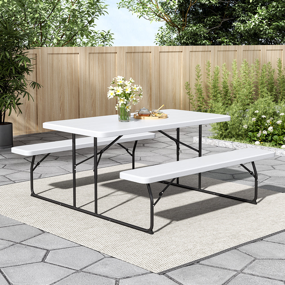 Discover the convenience and versatility of this picnic table and bench set, which features the bonus of natural aesthetics for your outdoor adventures. Crafted from robust high-density polyethylene with sturdy steel legs padded with anti-slip protectors, and designed with secure rounded corners, this set ensures a stable and safe sitting experience. Versatile enough to be used on a variety of outdoor occasions, the adjustable tabletop caters to your specific needs. Plus, the foldable design maximizes space efficiency, allowing for convenient storage when not in use.