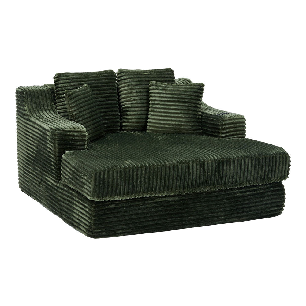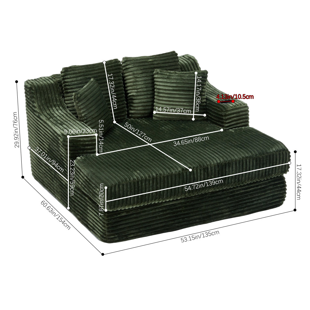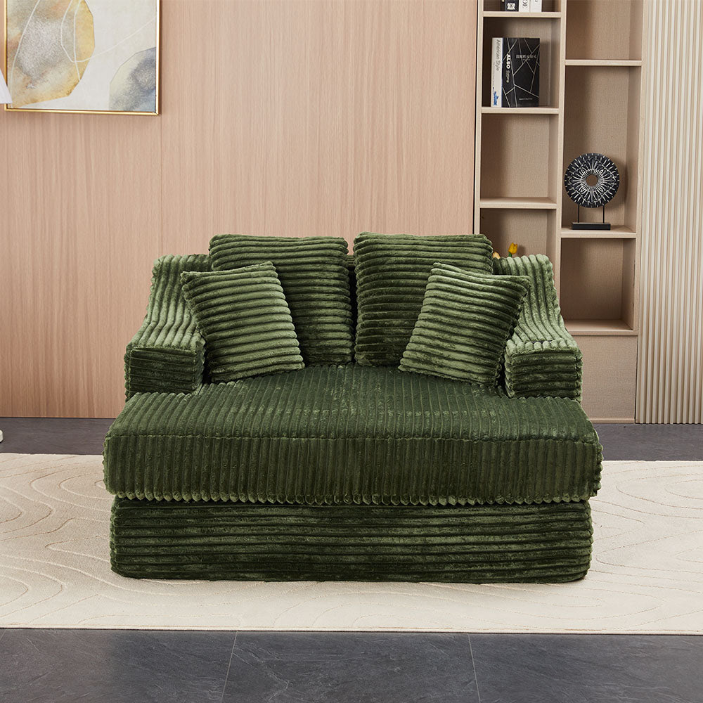 Discover a soothing retreat right at home with this chaise lounge sofa bed. Its clean, streamlined design complements any interior, while the soft corduroy upholstery with subtle vertical ribbing adds inviting texture. A built-in cup holder on the left armrest keeps your drink securely in place during reading, binge-watching, or peaceful moments of rest. Two matching throw pillows add extra comfort and a refined finishing touch. Whether you are enjoying a lazy Sunday afternoon or immersed in an intense gaming session, it offers a personal oasis where you can relax and unwind with ease.