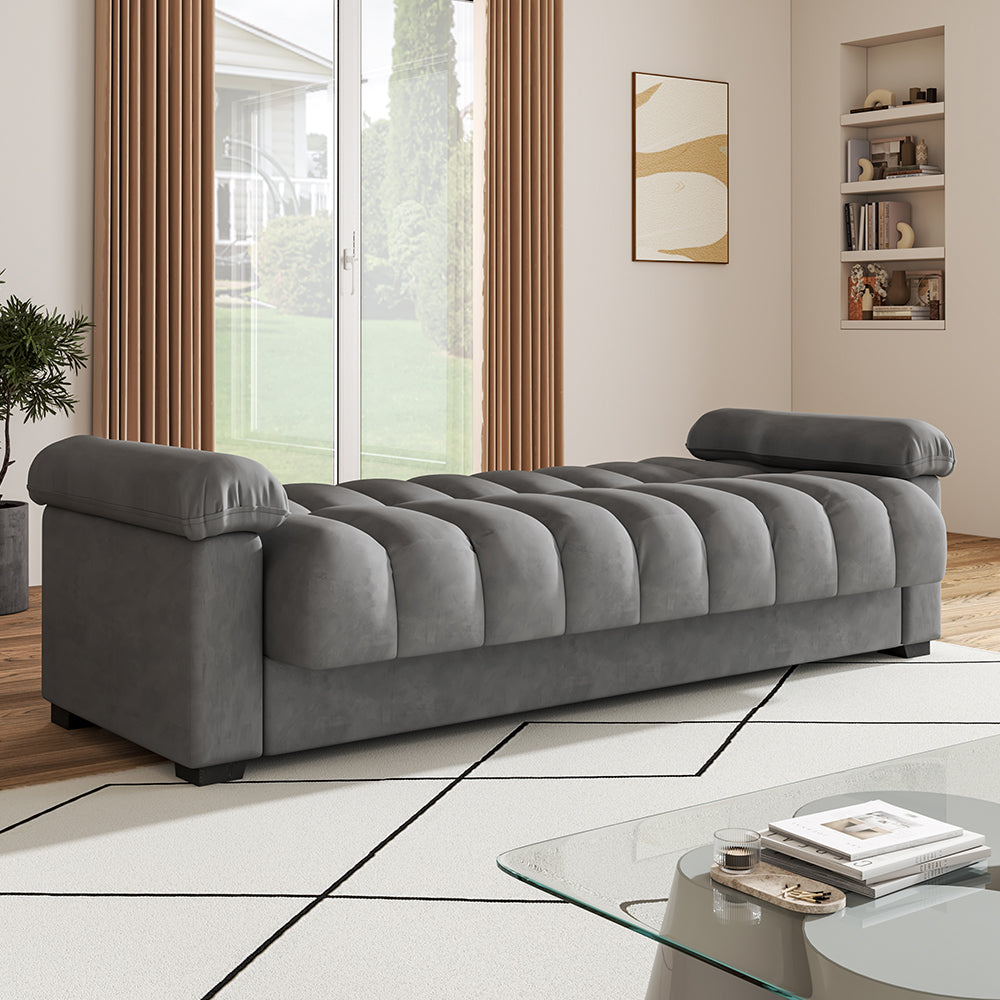 This sofa bed is designed for maximum comfort and style. Upholstered in high-quality fabric, it lends a remarkable sitting experience. The luxurious upholstery is highlighted by the channel design, creating a statement with a hint of personality, while the grey tone makes it easy to coordinate with different decor styles. Plus, the sofa effortlessly transforms into a cozy sleeper bed, providing a comfortable sleeping solution for guests or a quick nap.