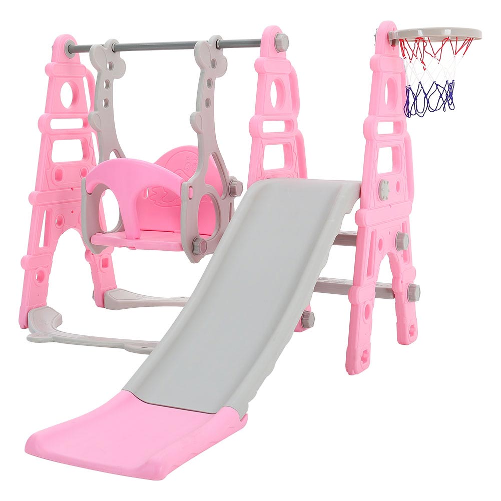Our multi-functional set provides children with different playing experience indoors and outdoors. It combines a smooth slide, a sturdy swing, a basketball hoop and climbing ladders in one, any child can have great fun with it. All activity elements are appropriately sized for toddlers.