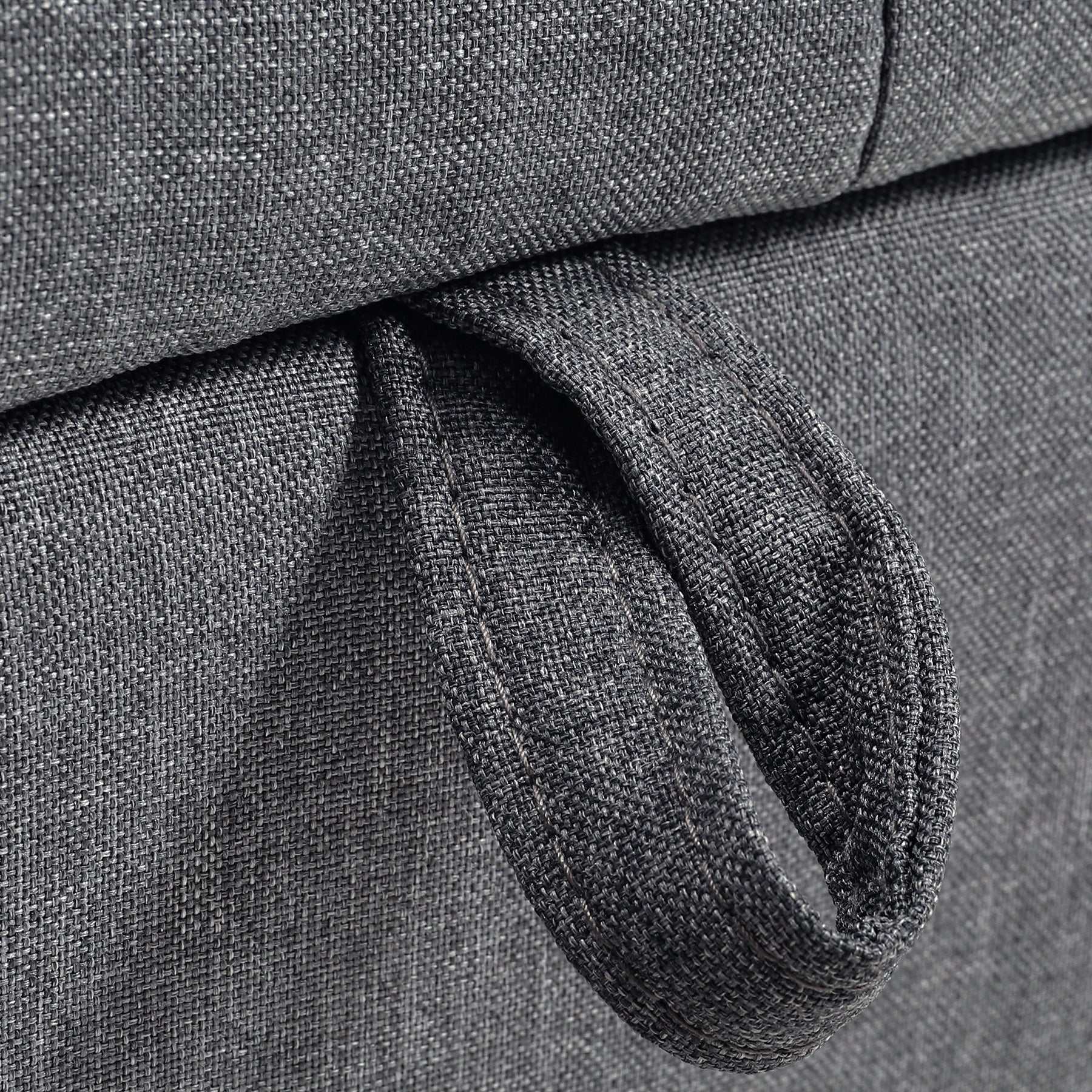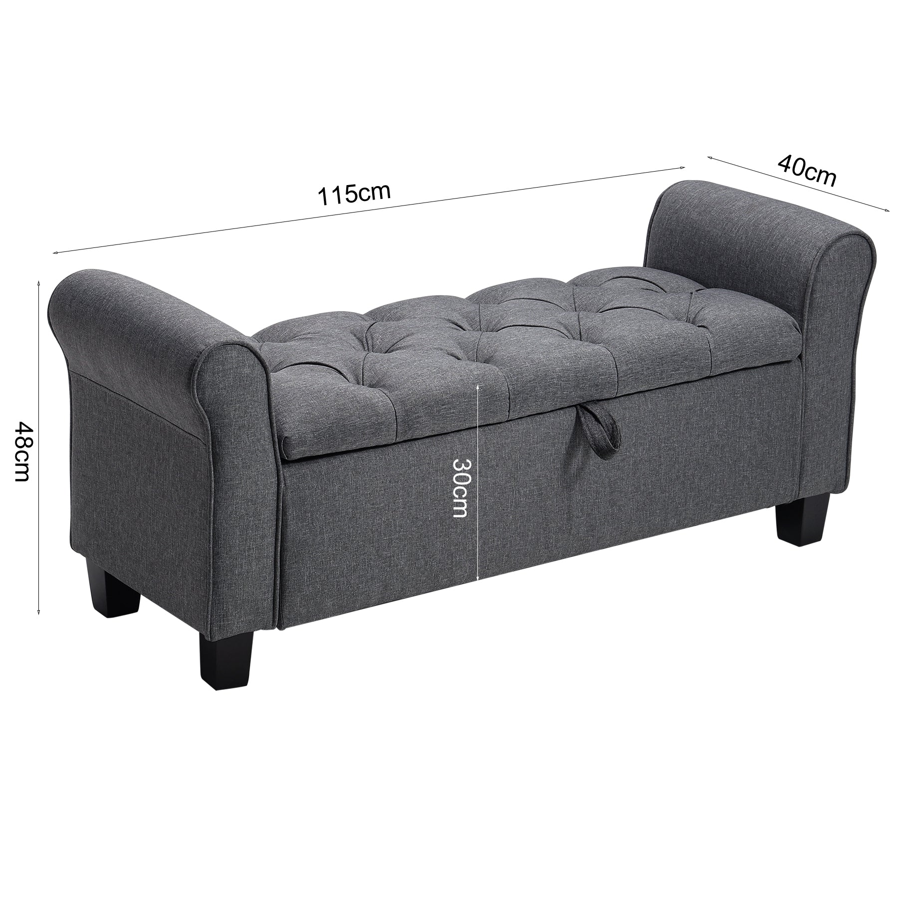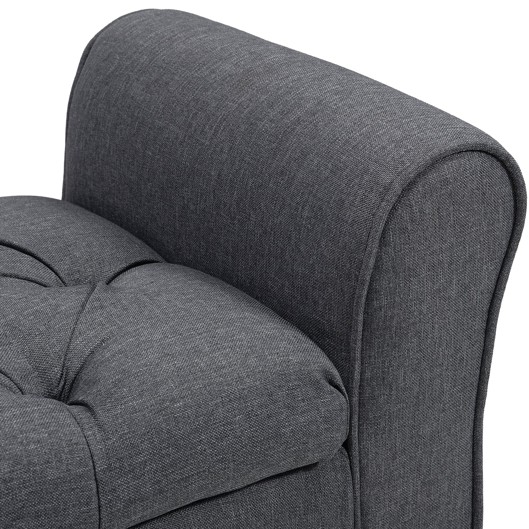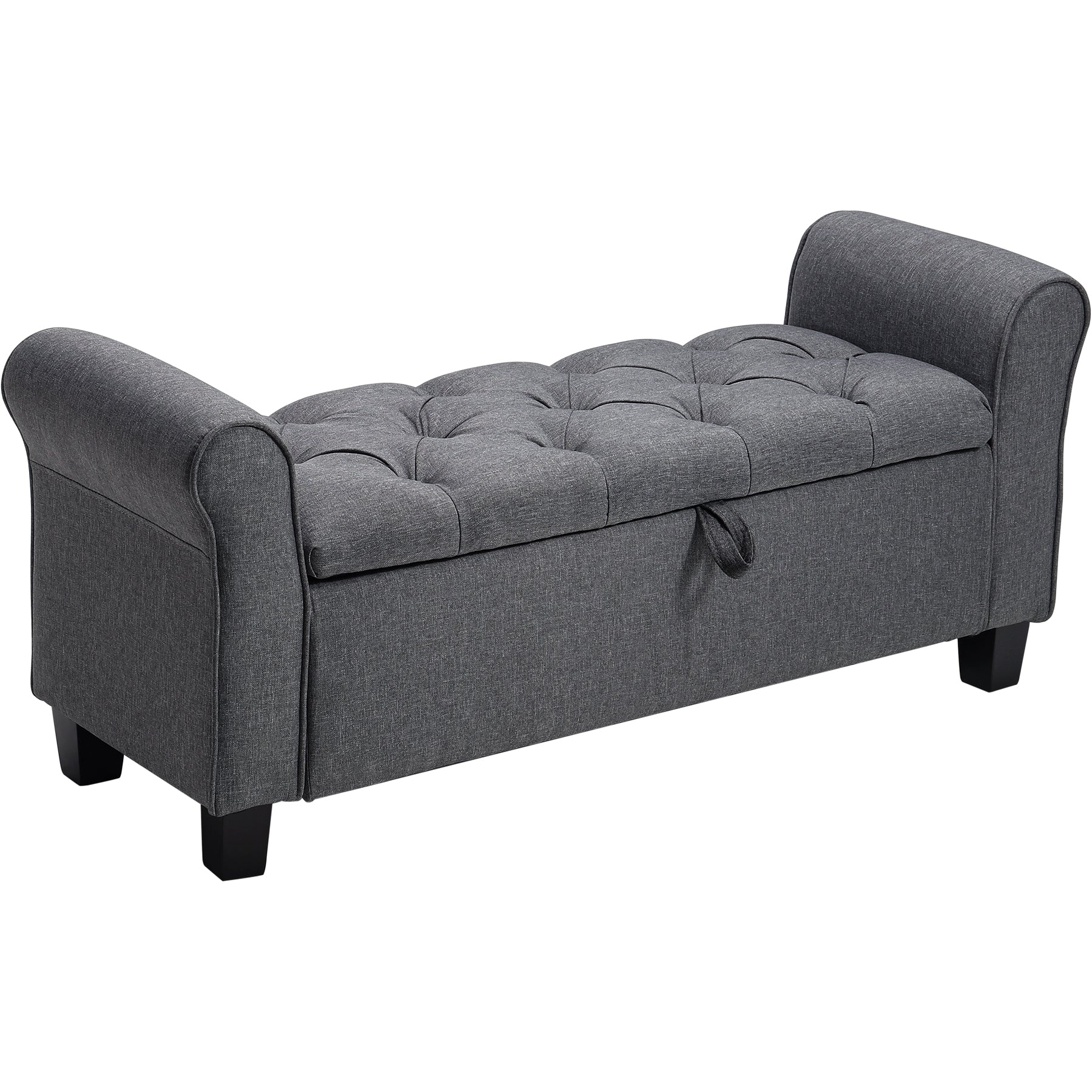 This storage ottoman has been upgraded from a bench by adding armrests on both sides and an inner storage compartment. It stands from the ground on four chunky black wooden legs, and thanks to them, the ottoman is stable and performs excellently in remaining sturdy. It is sure to bring glamour to your home with its comfy profile and versatility. Settling it at the end of your bed, our stunning ottoman bench will offer enjoyment both visually and functionally.