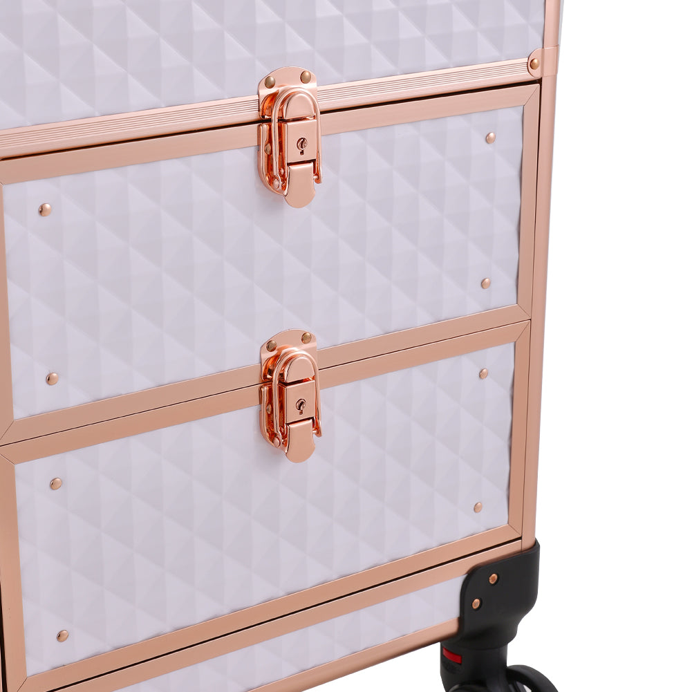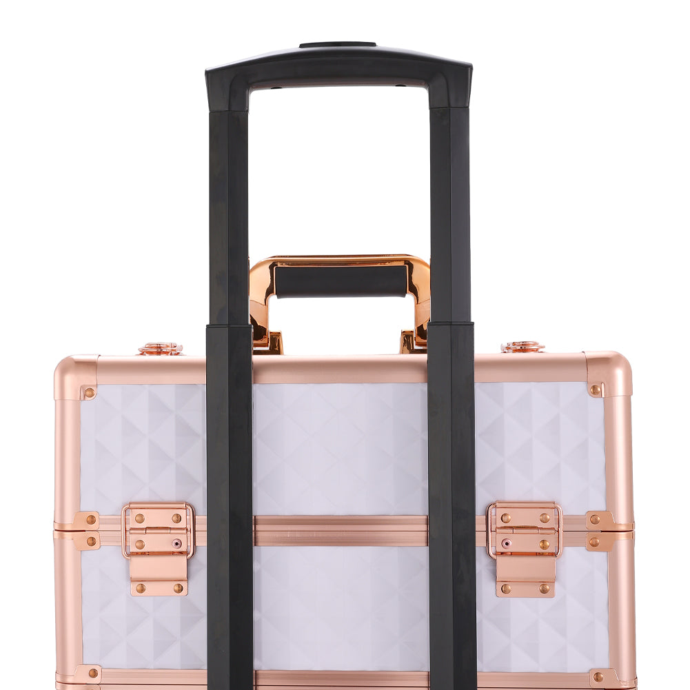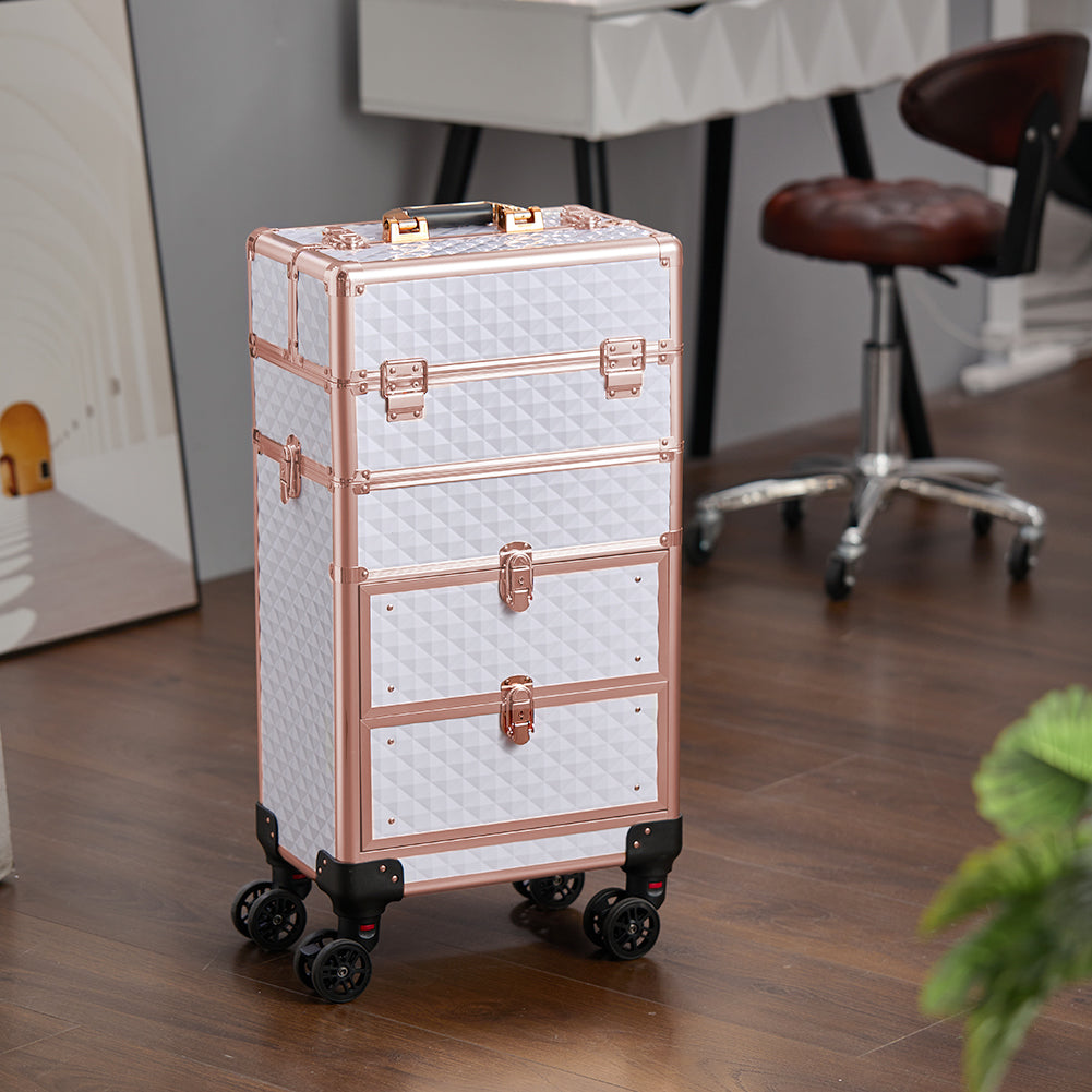 Our Multi-functional Cosmetic Trolley Case is an indispensable asset for makeup artists and beauty lovers who demand convenience and style. The product includes a spacious detachable main makeup case, which also serves as a portable makeup train case. The first drawer can store a variety of beauty tools and the bottom drawer comes with detachable dividers that allow you to adjust the storage space at will. The equipped roller and telescopic handle allow you to easily carry it anywhere, ensuring that you can effectively focus on your makeup work.