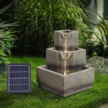Durably constructed from high-quality resin, this fountain features a classy 3-layer profile. Its clean lines and rustic finish can instantly make any outdoor space peaceful and tranquil. Thanks to the built-in LED lights, you get to admire the way water is illuminated as it flows from top to bottom. To set it up, just insert the solar panel in a place where the sun can shine and the rest left is to enjoy.