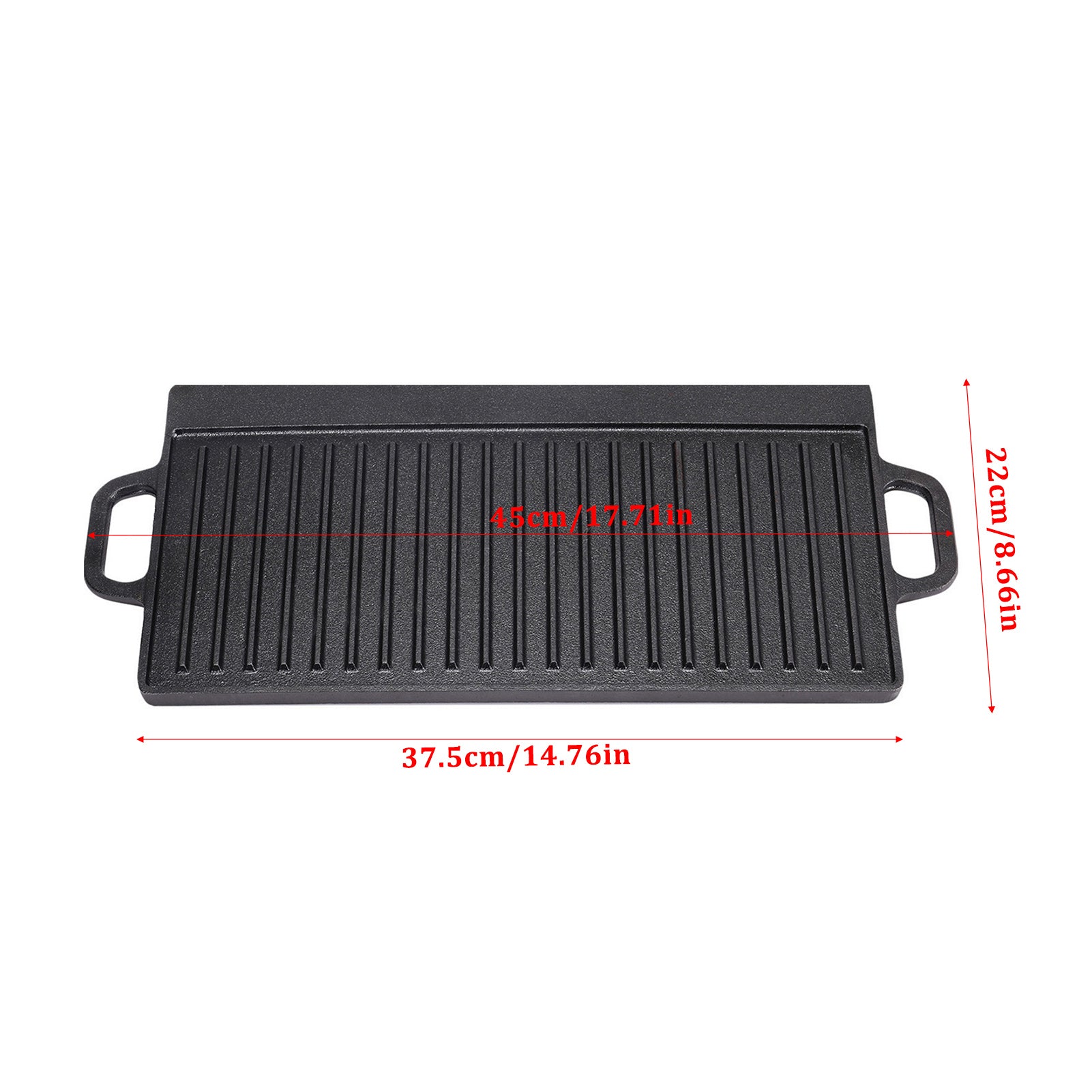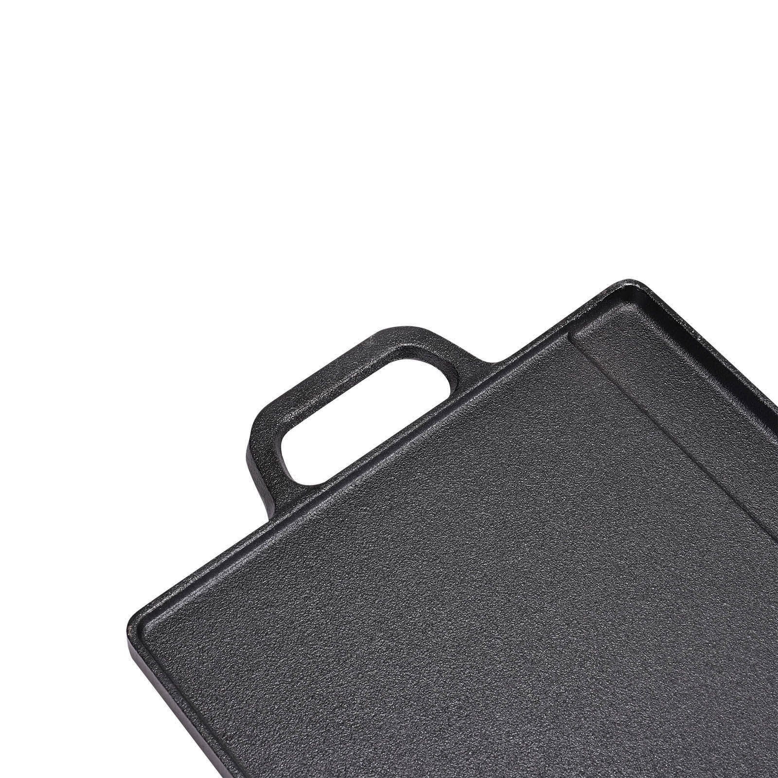 Experience the joy of cooking with this cast-iron pan. This versatile griddle pan offers a smooth side for frying pancakes and eggs, while the ribbed side is perfect for searing steaks and sausages, creating impeccable grill marks. Its large surface makes it ideal for family camping, allowing you to cook multiple ingredients simultaneously, enhancing efficiency and saving time. Designed to help you effortlessly prepare healthy and delicious meals, this grill pan is a valuable addition to your kitchen arsenal.