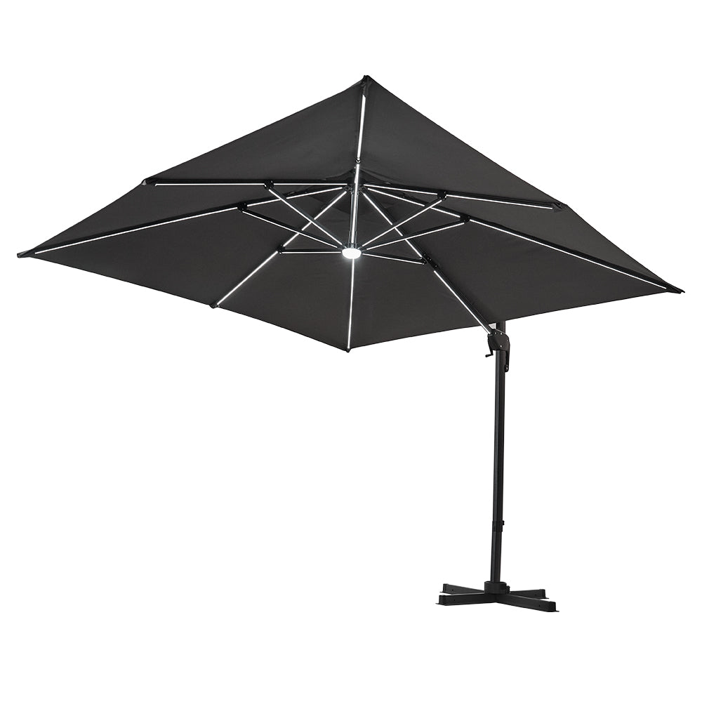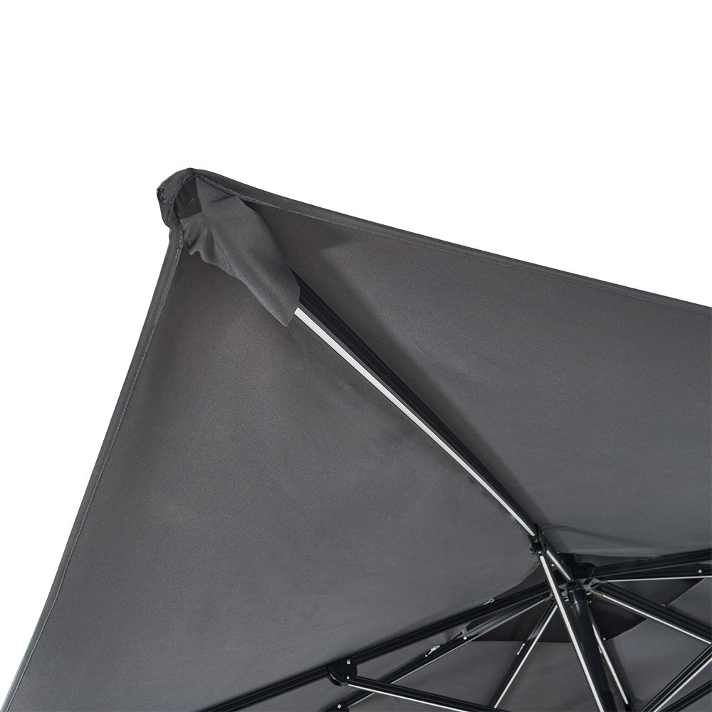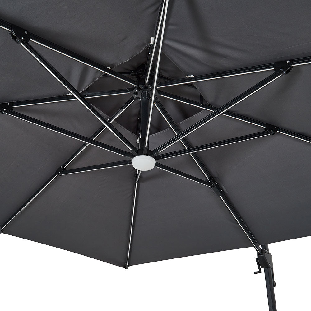 Light up your nights with this solar-powered LED cantilever parasol. Featuring a stunning overhanging design and LED spotlights on the inside, this 3-meter garden parasol blends functionality with contemporary style. The solar-powered LEDs illuminate your summer evenings in an environmentally and cost-effective way. With an easy-to-use wind-up crank, the parasol opens and closes effortlessly, providing quick shade with minimal effort. For enhanced stability, the water- and sand-filled base ensures optimal firmness. Its wide, flat design evenly distributes weight under the pole, while the adjustable weight feature allows for custom stability, making it the perfect complement to your outdoor space.