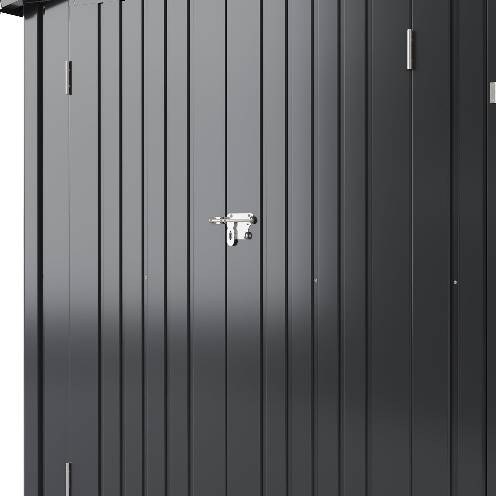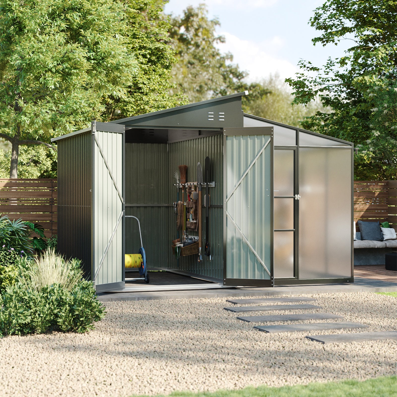 Spacious & Accessible: The tool shed offers ample headroom and floor space for versatile storage. Two wide swing doors provide full access to the interior.