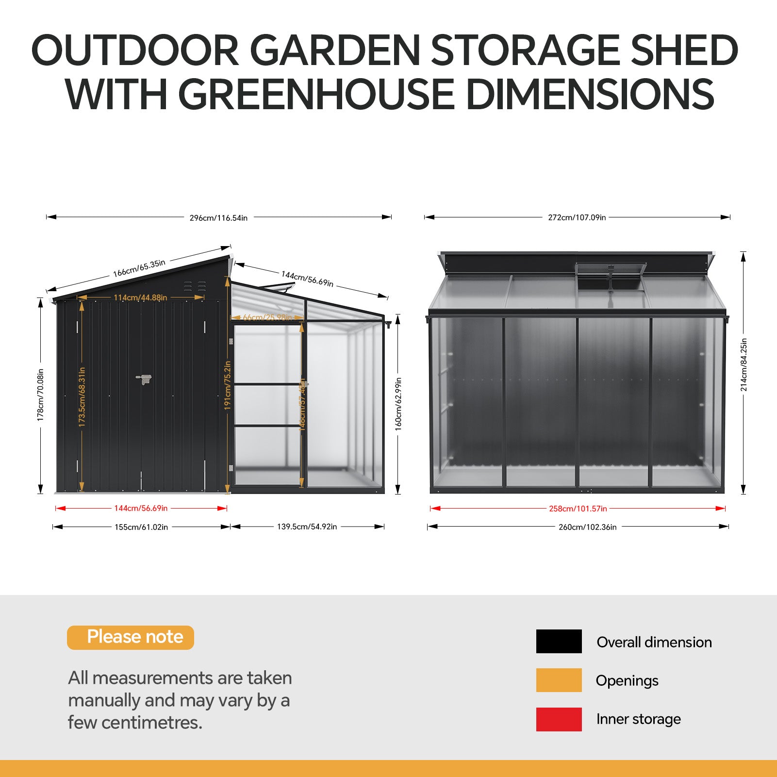 Overall Dimensions (Tool Shed): 163W x 272D x 213H cm (Ridge Height: 213cm)