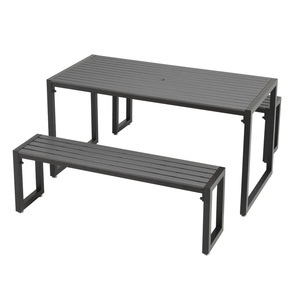 This Livingandhome table and benches set combines both modern and traditional styles with WPC tops and metal frames. This set contains a pair of benches and a rectangular table that is designed for gathering with friends and family to spend the weekends. Best of all, this set can withstand both sunny and rainy days since there’s a hole in the middle to place a parasol. It is the perfect addition to your garden.