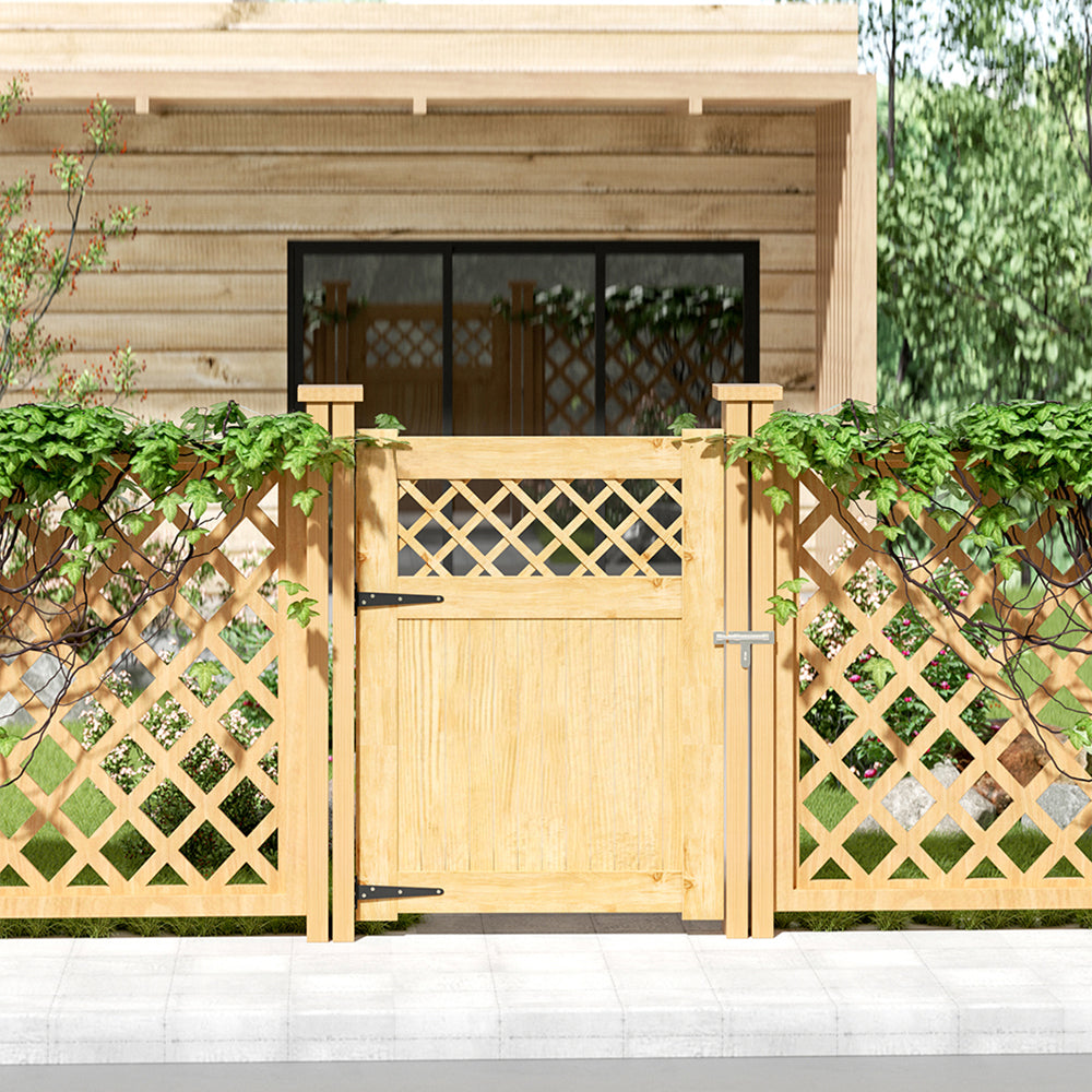 As the gate for your house, our Wooden Garden Gate exudes a rustic aesthetic and is designed to elevate the charm of your garden. Boasting a natural wood grain slatted surface and a hollow rhombus lattice design above, this gate combines rustic allure with sturdiness. It serves as a protective barrier, ensuring the safety of children or pets while enhancing the visual appeal of your outdoor space. Crafted with high-quality wood and meticulous workmanship, this gate demands minimal maintenance and promises long-lasting durability.
