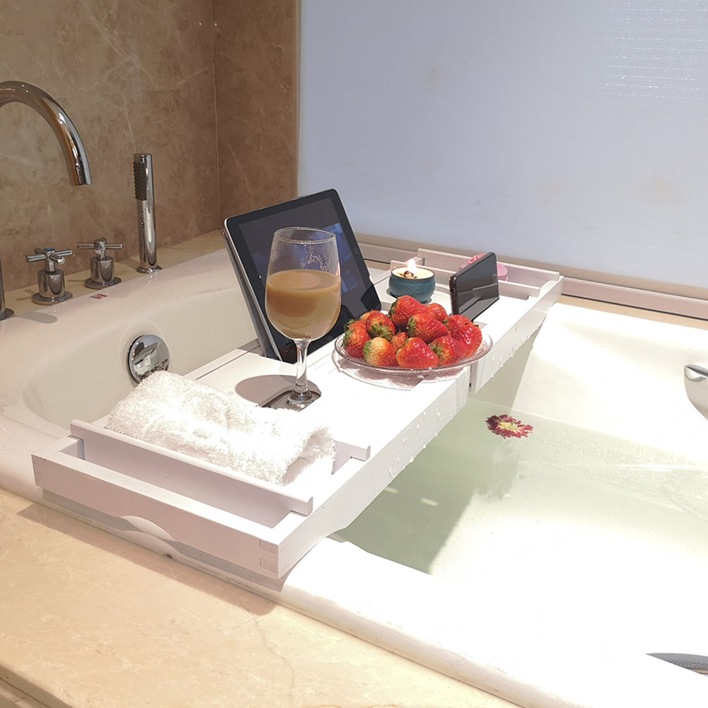 While you are enjoying your relaxing bath, our bathtub tray can keep your items within reach on the tray. From your wine glass, your mobile phone, tablet to your towel, you can easily reach the thing you need and with the slots that hold them properly, you can rest assured that your things are right where you need them. Made of bamboo, the wooden bathtub tray can add a sense of peaceful and rustic touch to your bathroom.
