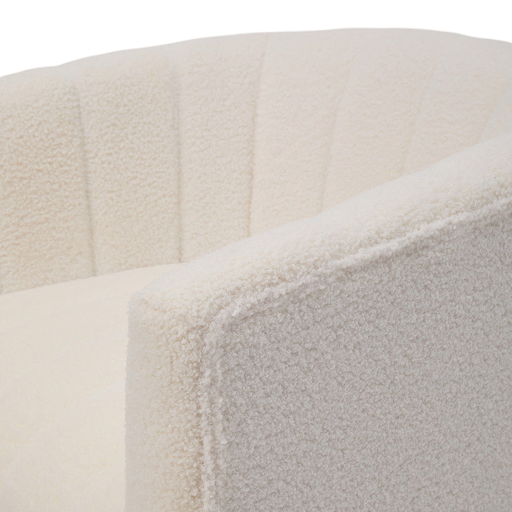 Indulge in luxurious comfort with the upholstered swivel accent armchair! The white hue creates a sense of purity and sophistication, effortlessly complementing any décor style. Its backrest and arms flow seamlessly into a beautiful and streamlined barrel shape that exudes contemporary charm. It offers unparalleled support and relaxation, whilst the upholstery is accentuated by exquisite channel stitching. The 360° swivel base with non-slip feet pads greatly enhances flexibility and convenience, allowing for effortless seat adjustments and a clear view. Whether used as an accent piece in the living room, a statement chair in the bedroom, or a sophisticated addition to an office, this armchair effortlessly enhances any space.