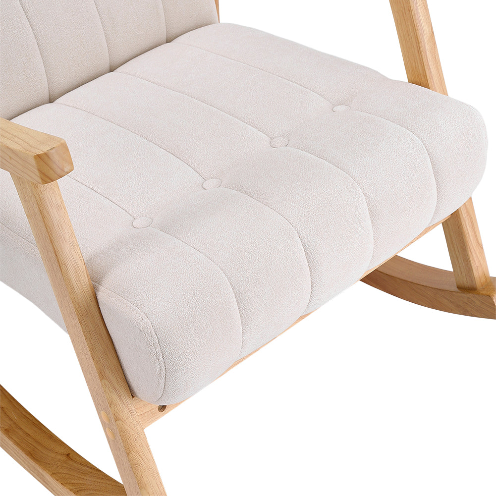 This rocking chair masterfully blends minimalist aesthetics with comfortable experience. Its uniquely designed rocking base creates smooth and steady motion, evoking the gentle sway of a cozy cradle. The seamlessly molded backrest and seat conform ergonomically to the body's contours, providing optimal support for the lumbar and back to effectively alleviate physical fatigue. Crafted from solid wood, the frame showcases natural textures and warm tones that add an organic touch to any living space. Whether placed on a sunlit balcony or in a quiet bedroom corner, it serves as your ideal companion for relaxation and leisurely moments.