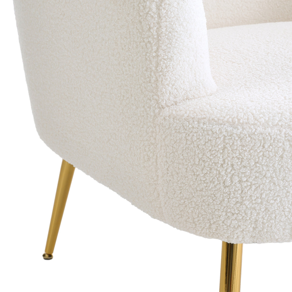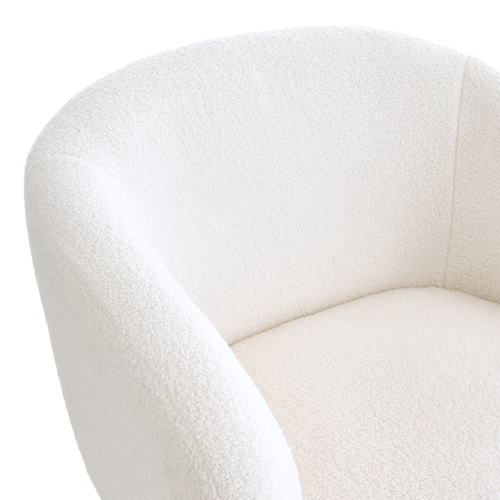 Sink into the cloud-like softness with the White Teddy Fabric Armchair. Constructed from a solid wood frame, it features a soft silhouette with rounded arms and a tight back filled with dense foam for an overstuffed look that invites you to lounge or read. It is also fitted with four slim, tapered legs set at a slant. Its contemporary profile is sure to make it an ideal addition to your living room.