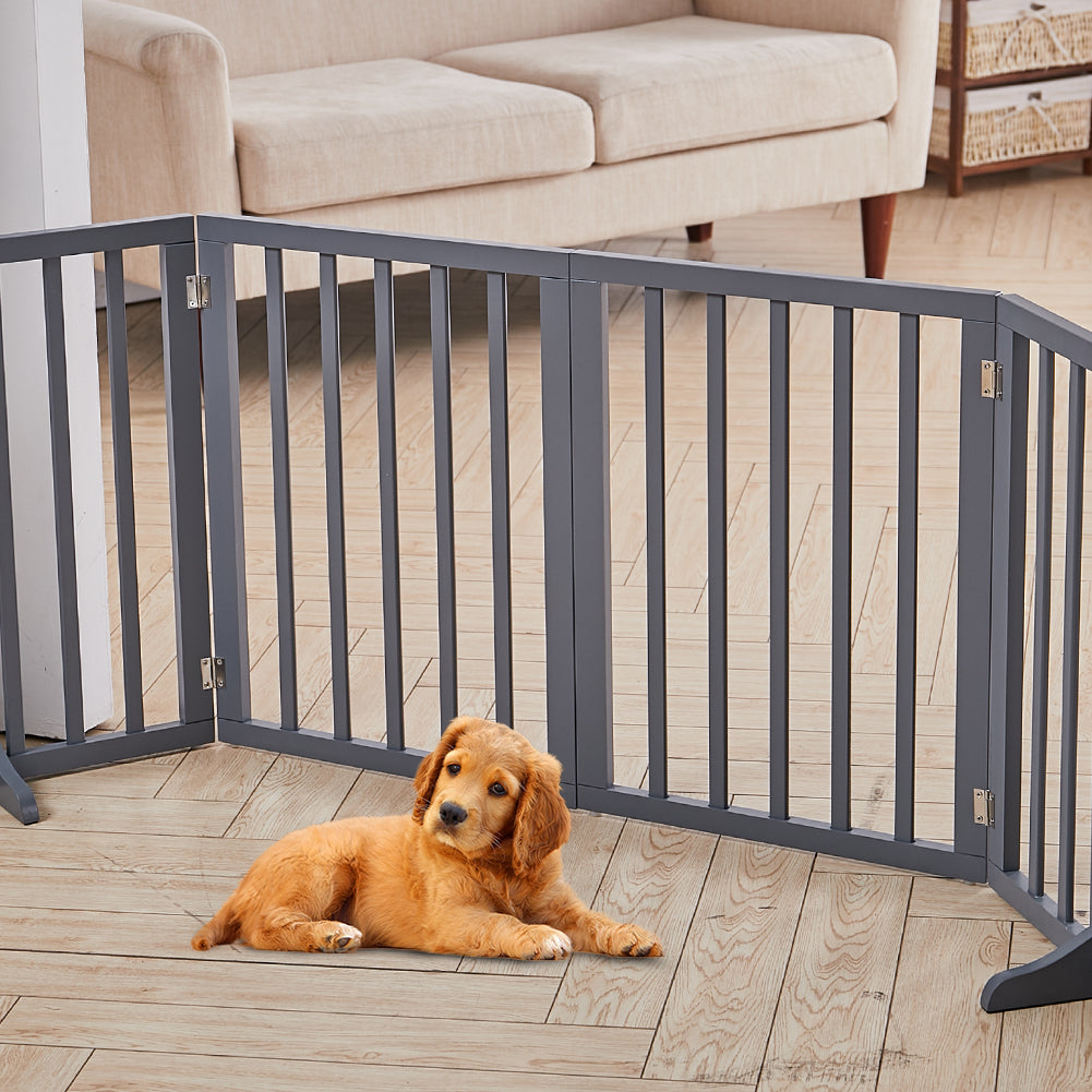 Our pet gate provides a safe and efficient way to divide a certain area for your pets to play and move about. The tall gates provide a proper barrier for larger animals. Gate is built with 4 separate panels secured together with sturdy hinges allowing the gate to fold out into a Z-shape configuration. Once folded up, the gate is free standing and is suitable to be used in entryways, halls, bedrooms and staircases.