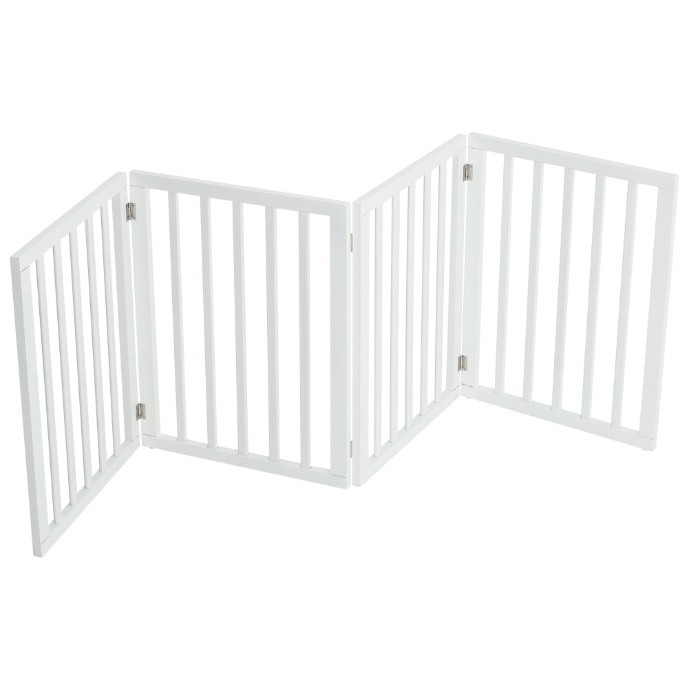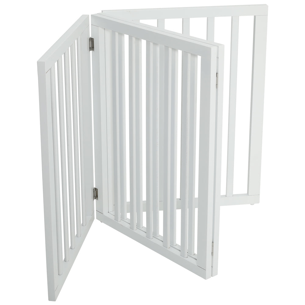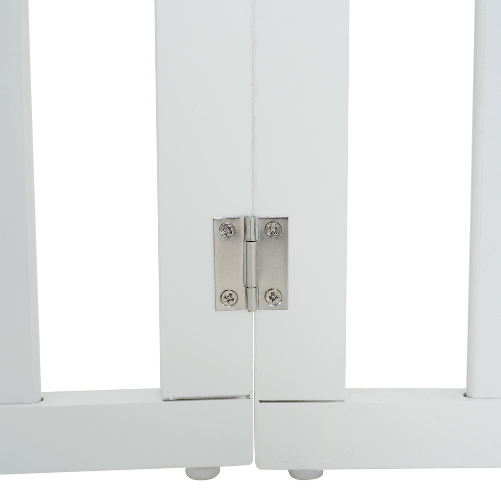 Our pet gate provides a safe and efficient way to divide a certain area for your pets to play and move about. The tall gates provide a proper barrier for larger animals. Gate is built with 4 separate panels secured together with sturdy hinges allowing the gate to fold out into a Z-shape configuration. Once folded up, the gate is free standing and is suitable to be used in entryways, halls, bedrooms and staircases.